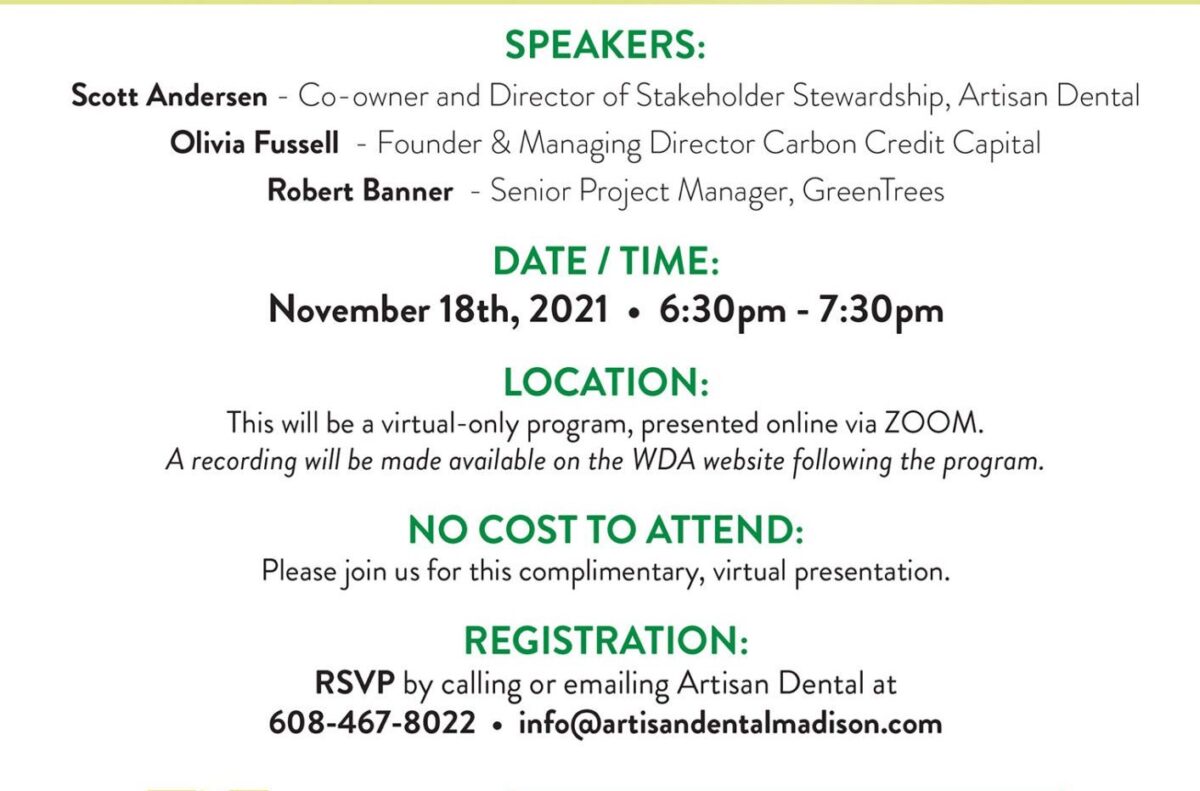 Artisan Dental is sponsoring a free VIRTUAL webinar – “The Carbon Neutral Dental Office” – from 6:30 to 7:30 p.m. on Thursday, Nov. 18. Speakers include Scott Andersen, co-owner and director of stakeholder stewardship at Artisan Dental; Olivia Fussell, founder and managing director of Carbon Credit Capital and Robert Banner, senior project manager for GreenTrees. “We see carbon offsetting as an important element of a comprehensive plan to reduce our negative impact and enhance our positive impact, realizing our mission to serve all of the stakeholders connected to our business,” said Scott Andersen, Artisan Dental’s Director of Stakeholder Stewardship and co-owner of the practice with his wife, Dr. Nicole Andersen. “We feel we have both a responsibility and an opportunity to be good stewards of the environment we all enjoy and depend on.” Register by calling (608) 467-8022 or emailing info@artisandentalmadison.com.